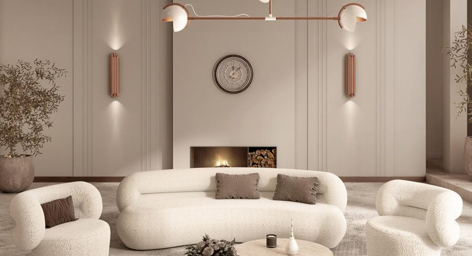 Meubles aux formes arrondies (canapés, tables, luminaires), courbes dominantes, effet “cloud” notamment dans le style Japandi revisité